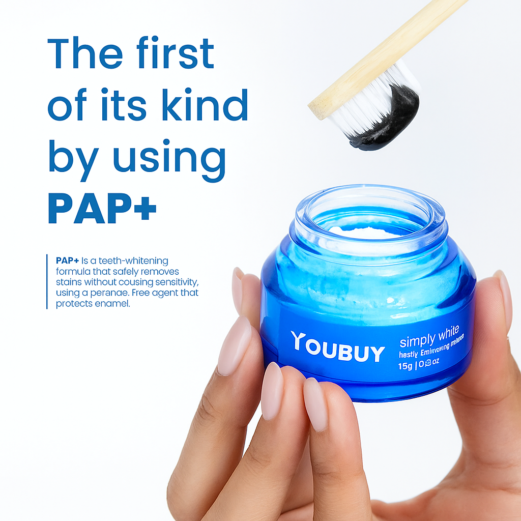 YouBuy uses a peroxide-free PAP+ formula that gently breaks down surface stains and discoloration without damaging enamel. It whitens teeth safely by oxidizing stains instead of harsh bleaching, giving you a natural bright smile.
